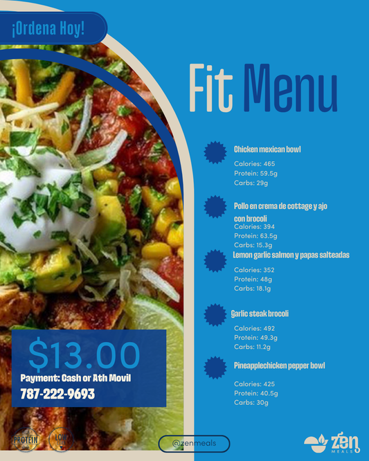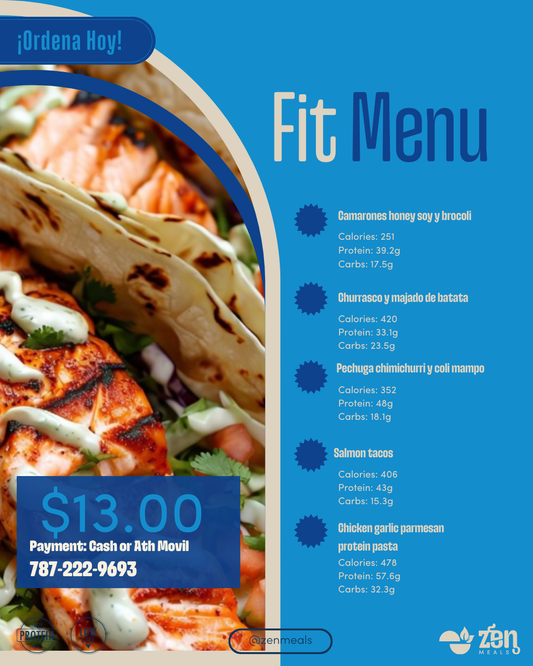 Fit Menu: 4oz de un acompañante (carbohidratos, batata mameya o arroz jazmín) y 6 oz de proteína.
