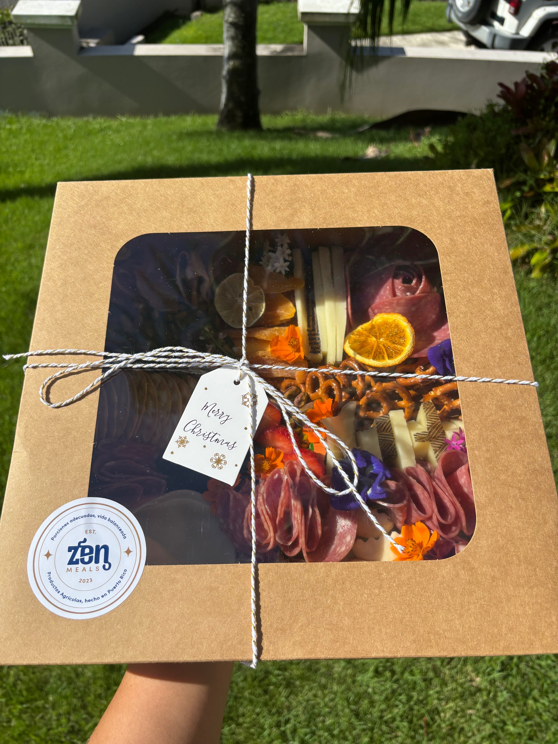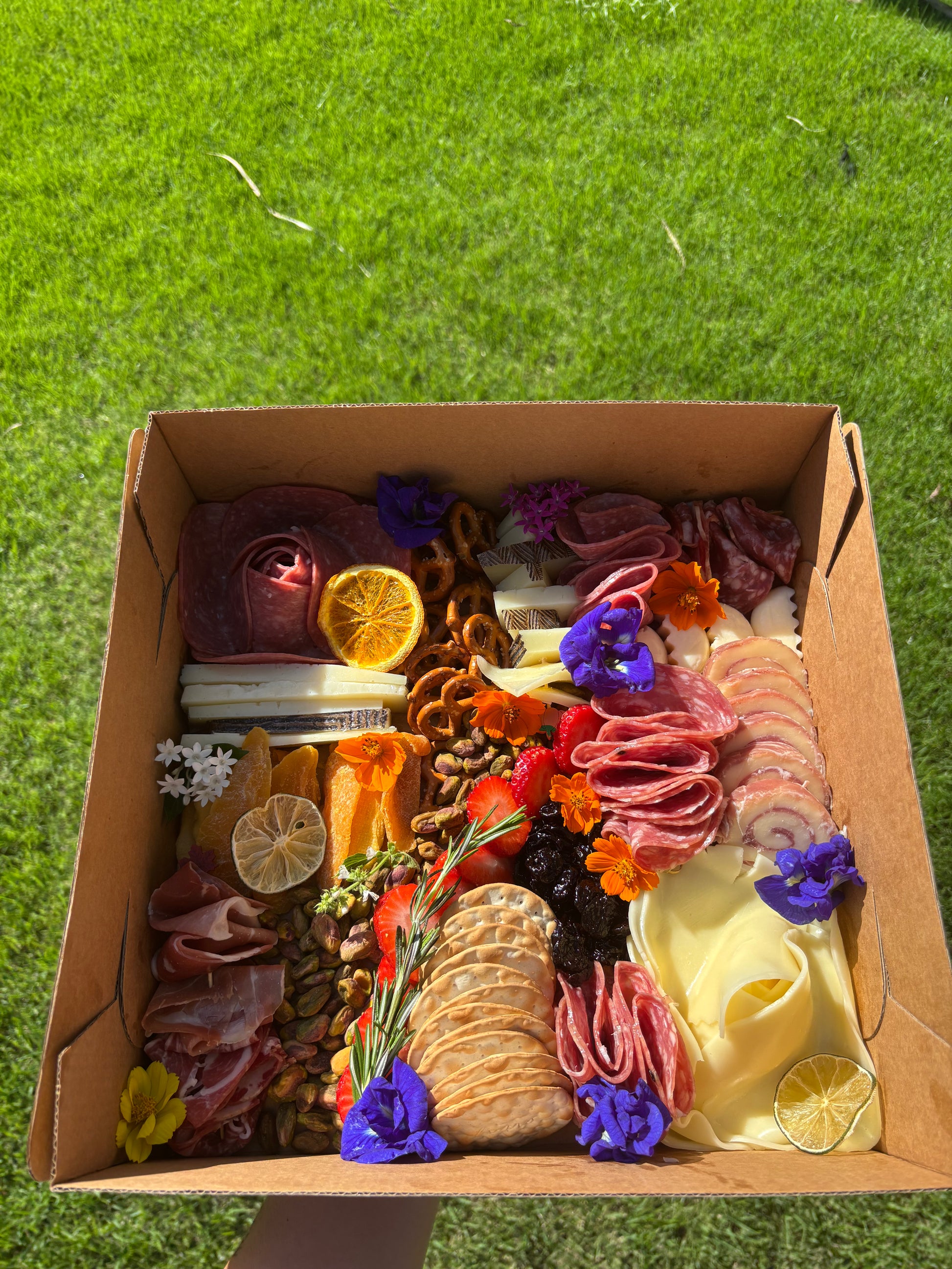 Una presentación abundante y cuidadosamente elaborada para elevar cualquier celebración. Esta tabla incluye una selección de seis cortes fríos premium y seis tipos de quesos artesanales, acompañados de frutas frescas, frutos secos, nueces, pretzels, galletas, cítricos deshidratados y detalles de flores comestibles que realzan su presentación.