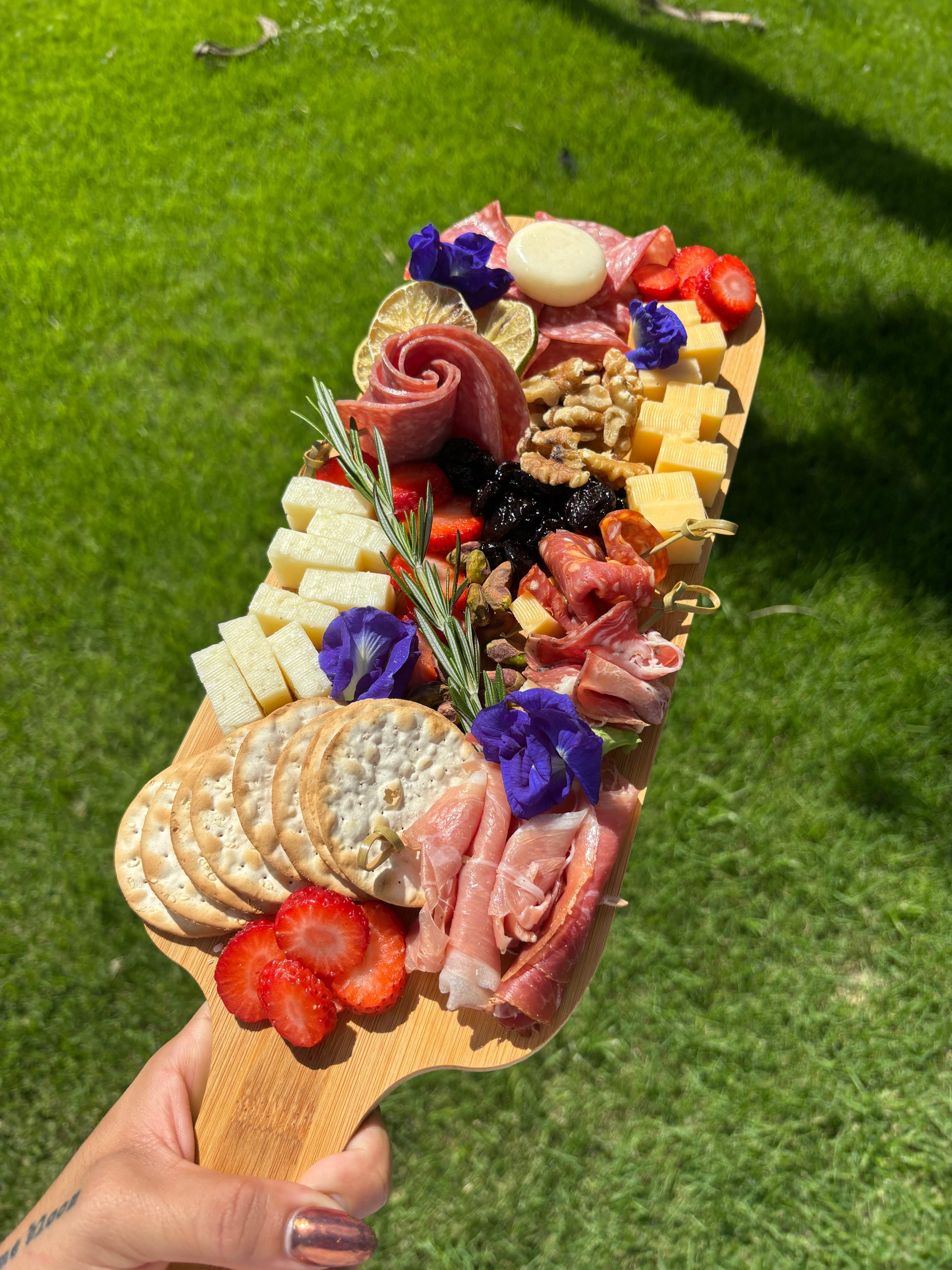 Una selección cuidadosamente presentada para compartir en ocasiones especiales. Esta tabla incluye variedad de cortes fríos premium, quesos artesanales, crackers, frutos secos, frutas frescas y detalles de flores comestibles que elevan su presentación.